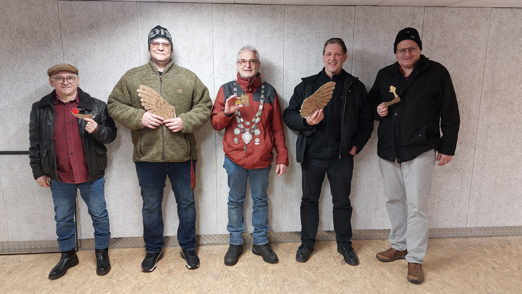 Stolz präsentieren die Sieger ihre Trophäen. Von links: Quintino Secreto (Apfel), Dennis Herzog (1. Ritter), Uwe Neuwirth (Schützenkönig), Dr. Wolfgang Duba (2. Ritter), Klaus-Dieter Lakrini (Zepter)